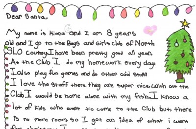 –Kiana, an 8-year-old girl who is a member of the San Luis Obispo County Boys and Girls Club, wrote the following letter to Santa this Full Article