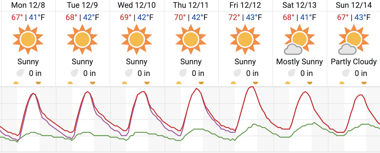 The weather will remain sunny Wednesday and Thursday, with daytime temperatures rising from 69 to 70 degrees and overnight lows holding around 42 degrees.