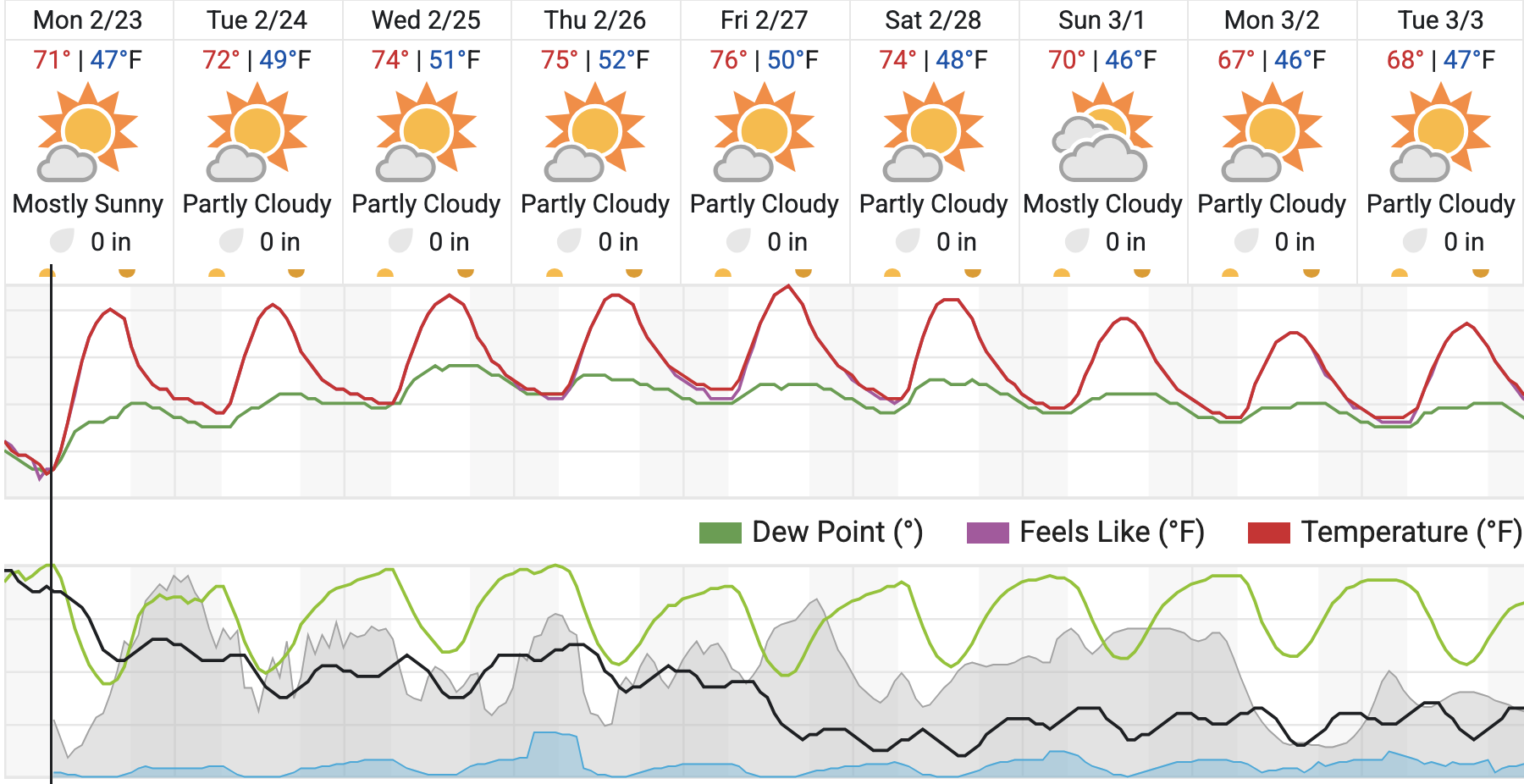Monday is expected to be mostly sunny with a high near 71 degrees and a low around 47. Tuesday will be partly cloudy with a high near 72 and a low around 49. Wednesday is forecast to be partly cloudy with a high near 74 and a low around 51. Thursday will be partly cloudy with a high near 75 and a low around 52.