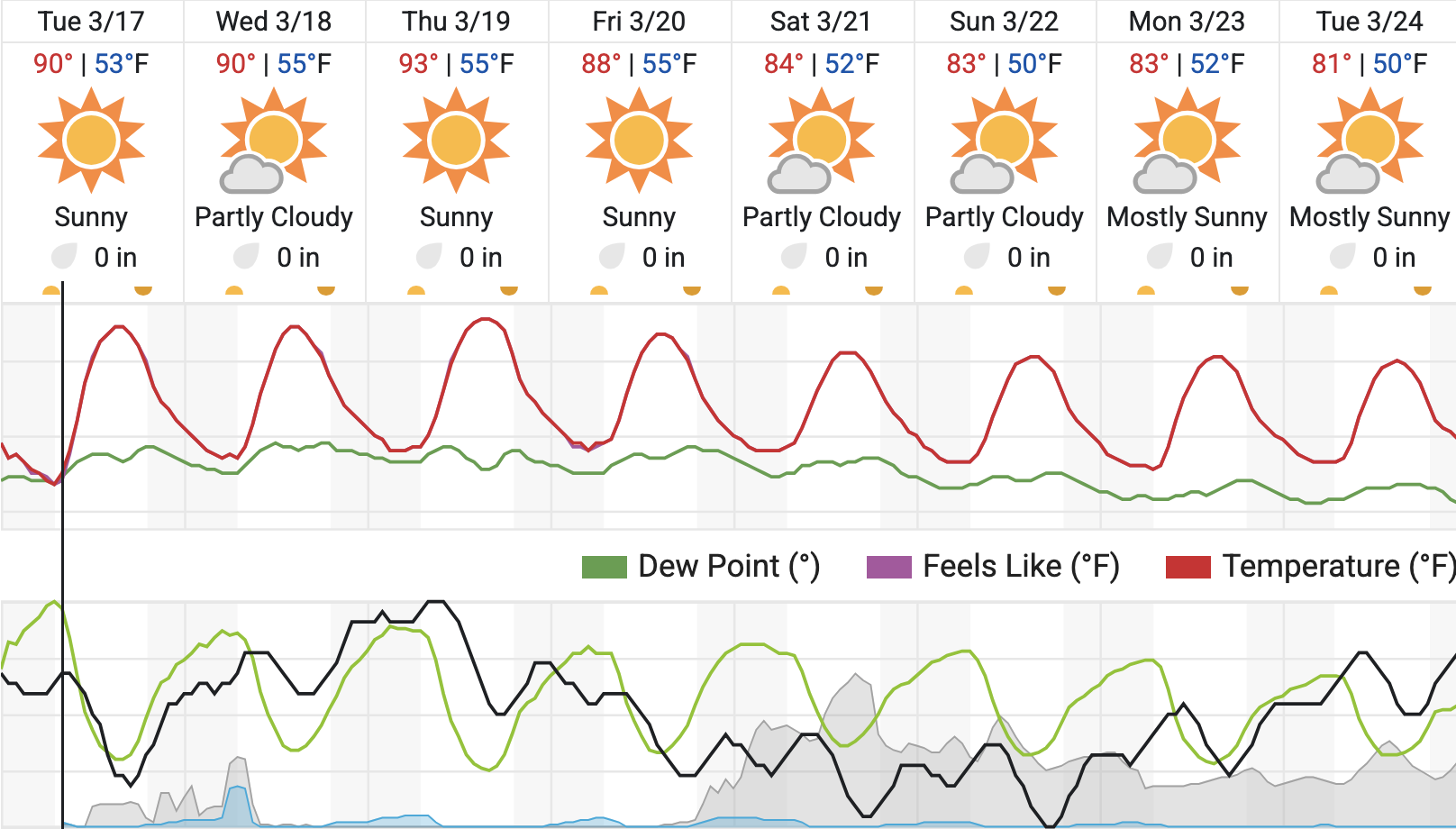 Tuesday’s high will hit 90 degrees under sunny skies, with a low of 53. Wednesday brings partly cloudy conditions with a matching high of 90 and a low of 55.