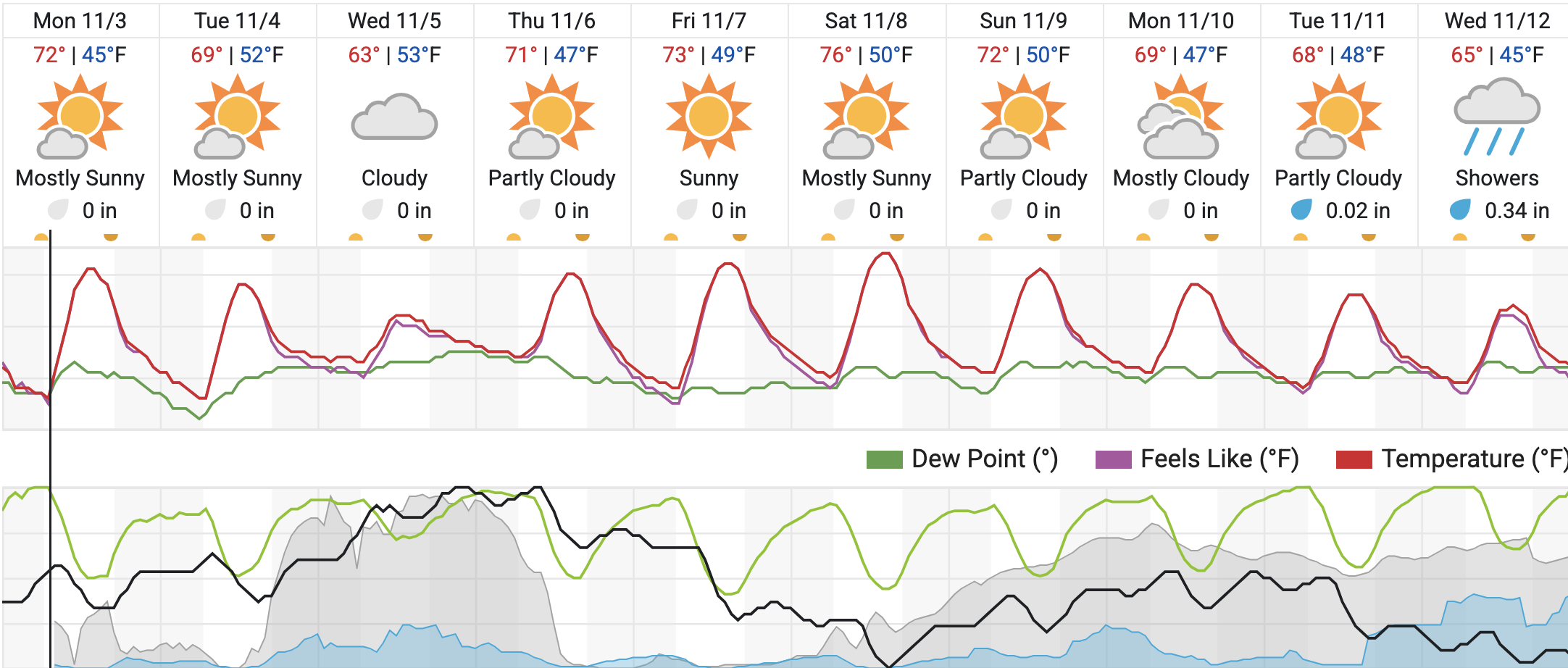 Looking ahead, Monday turns mostly cloudy. Light showers are possible Tuesday, Nov. 11, followed by showers on Wednesday, Nov. 12, with estimated totals near 0.02 inches on Tuesday and about 0.34 inches on Wednesday.