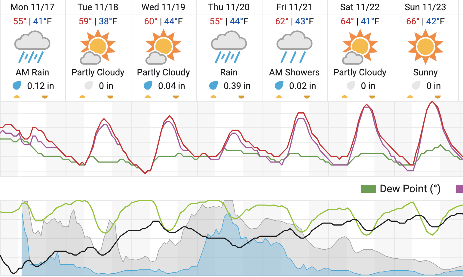 Partly cloudy skies continue Wednesday, when temperatures will reach 60 during the day and fall to 44 at night. Rainfall is forecast at 0.04 inches. Rain returns Thursday with a high of 55 and a low of 44, and total rainfall is expected to reach 0.39 inches.