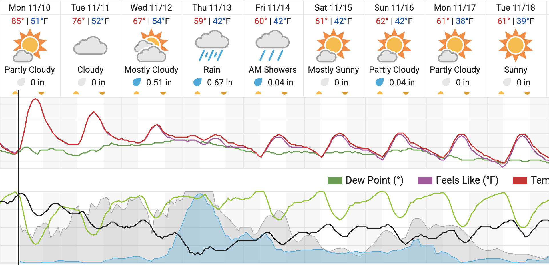 Temperatures are expected to reach a high of 85 degrees on Monday before dropping to the 70s on Tuesday and into the 60s by Wednesday. Rain is likely beginning late Wednesday, with about 0.5 inches expected.