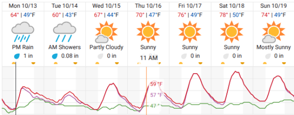 According to the seven-day forecast, rain will start Monday afternoon with about 1 inch of precipitation expected. Showers will taper off Tuesday morning, bringing an additional 0.08 inches of rain. Monday’s high is forecast at 64 degrees with a low of 49, while Tuesday’s high will reach 60 degrees with a low near 43.