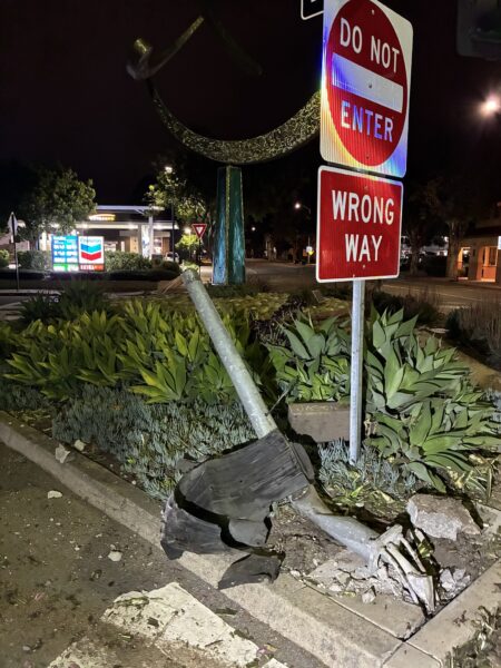 Highway patrol officers had come upon a single vehicle with extensive damage but no driver in or around the car. Officers found evidence along Higuera Street consistent with a vehicle traveling northbound against the one-way flow of traffic and potentially rolling over after striking a utility pole. An open bottle of vodka was found on the dashboard.