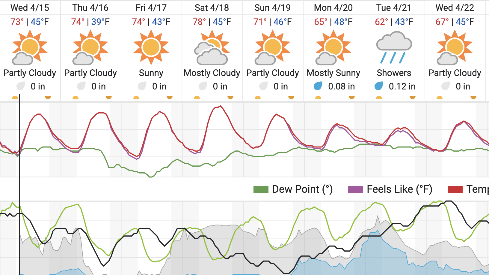 Temperatures are expected to reach the mid-70s through Friday, with mostly sunny to partly cloudy skies. Highs will peak near the upper 70s on Saturday before dipping slightly into the low 70s on Sunday.